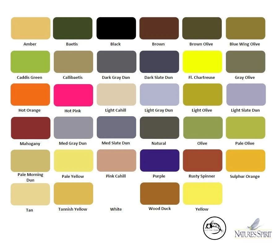 | Color | Brown Olive, Brown, Callibaetis, Olive Green, Golden Yellow, Gray Olive, Green, Hot Pink, Light Cahill, Light Olive, Muskrat Gray, Orange, Purple, Red, Royal Blue, Rusty Orange, Tan, BWO, Caddis Green, Fl. Blue, PMD |