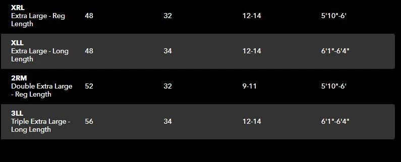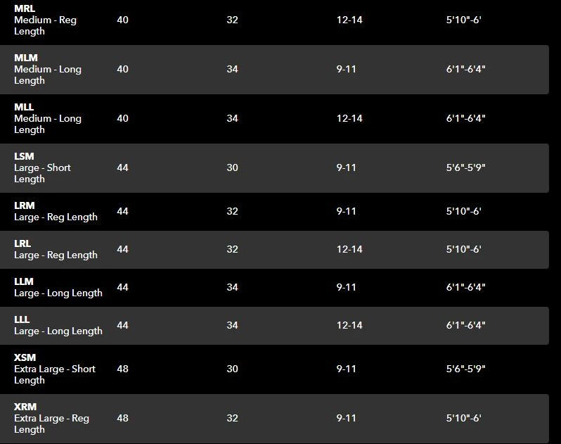 - 2nd letter indicates size in length of leg, R being regular and L being long
